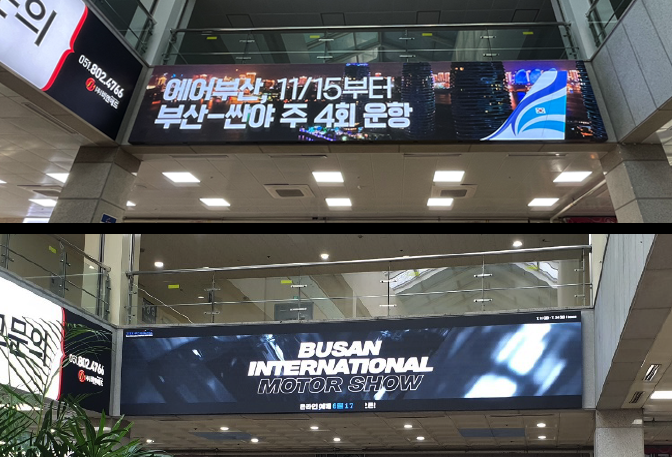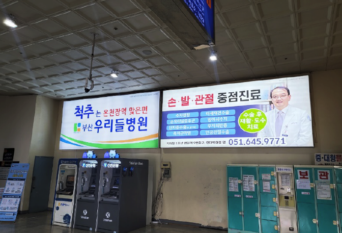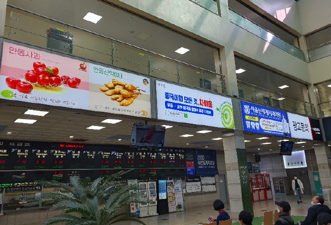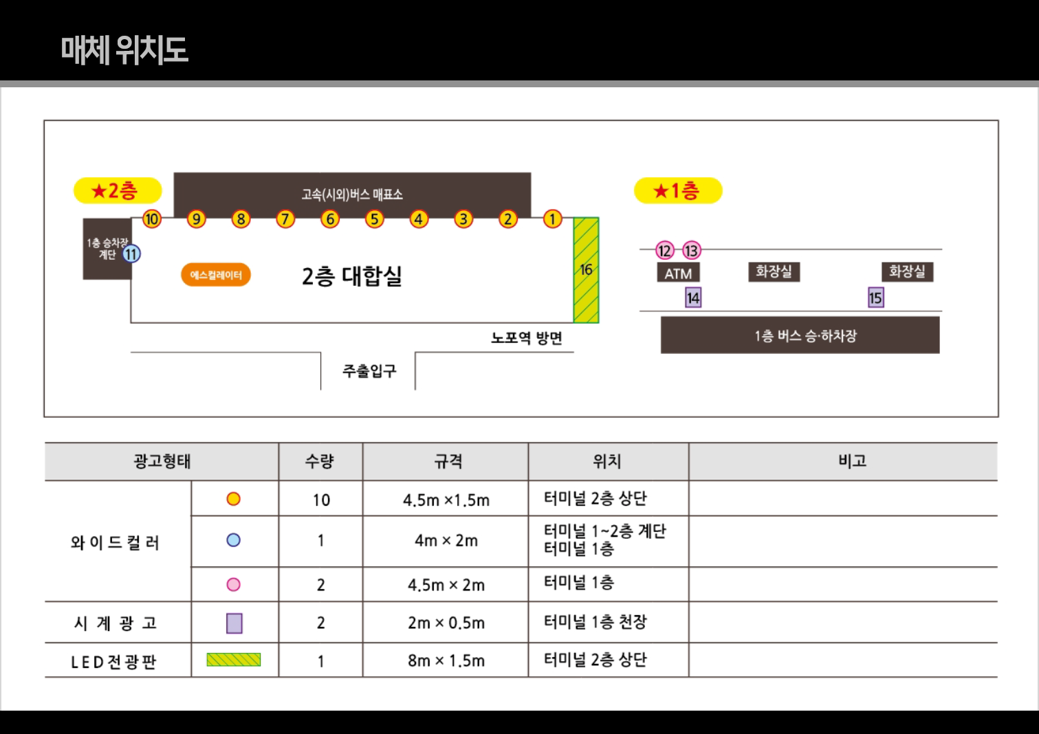 명칭 <1~10> 와이드컬러 A타입 규격(mm) 4,500 X 1,500 형태 LED라이트 패널 (패브릭) 광고료(월) 250만원 / 월 (VAT별도) 위치 터미널 대합실 2층 상단 -