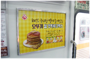 매체특징 전동차 중앙부위에 액자형태로 설치, 승객들의 눈높이에 맞는 메시지 전달, 비용대비 뛰어난 주목율이 장점