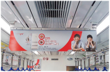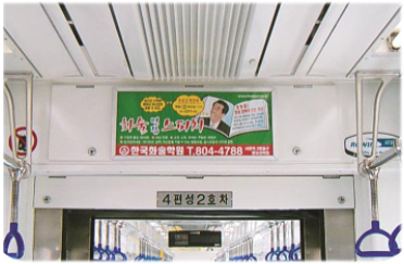 매체특징 전동차 천정측면에 위치, 승객혼잡도와 관계없이 지속적인 광고표출, 비용대비 넓은 메시지 표현공간이 장점